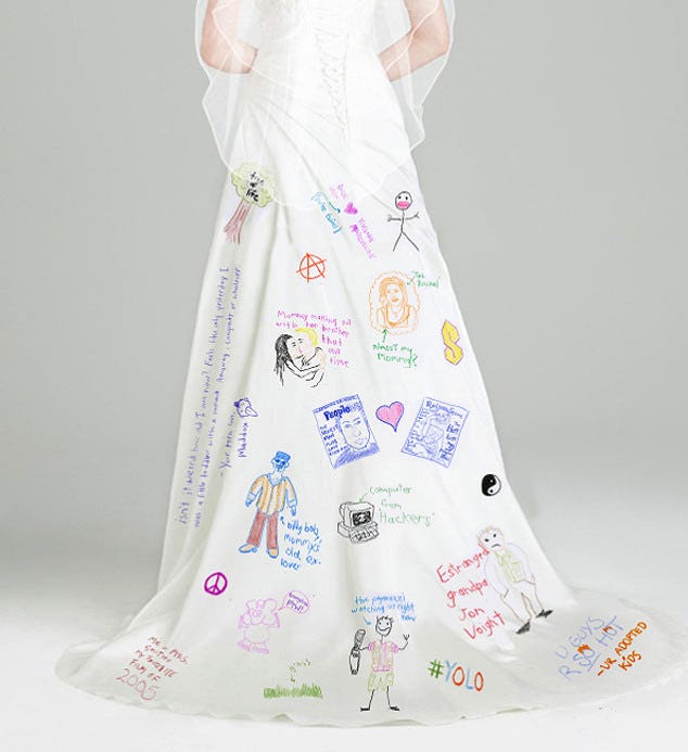 Angelina Jolie Let Her Kids Draw On Her Wedding Dress The Blemish - There's no doubt that angelina jolie looked breathlessly beautiful on her wedding day (even hubby brad pitt gasped when he lifted her veil!), but of course, each unique illustration represents a special family memory, so let's take a closer look at significance of the drawings on angie's custom dress!